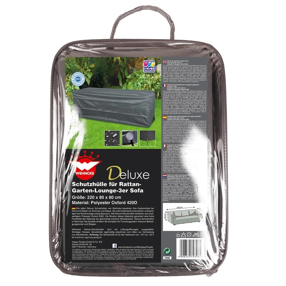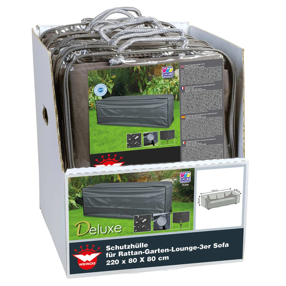 Cette housse de protection deluxe exclusive pour salon de jardin de la marque happy people protège votre mobilier de jardin contre les intempéries. Elle est facile à installer et nécessite peu d’espace de rangement lorsqu’elle n’est pas utilisée. Excellent matériau en polyester oxford 420d : toutes les housses de meubles d’extérieur deluxe sont fabriquées en polyester oxford 420d d’excellente qualité. Ce matériau est à la fois flexible et extrêmement résistant.cordon de serrage pour une fermeture serrée : ces housses de meubles de jardin sont dotées d’un système de fermeture à cordon, comprenant un cordon et un bouchon.bien ventilées : elles sont conçues avec des ouvertures d’aération pour empêcher l’humidité de pénétrer dans votre mobilier de jardin. Remarque :enlever régulièrement les housses de protection et les faire sécher par aération afin d’éviter les taches de moisissure.