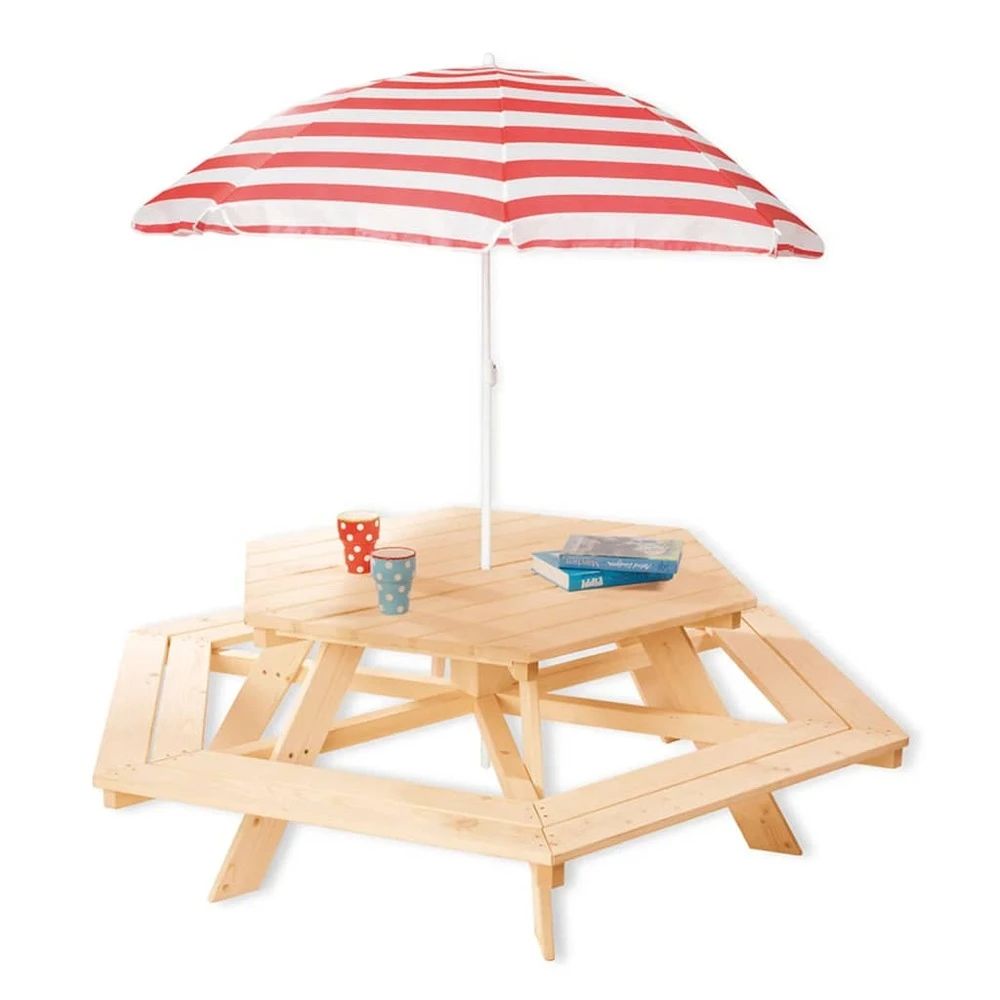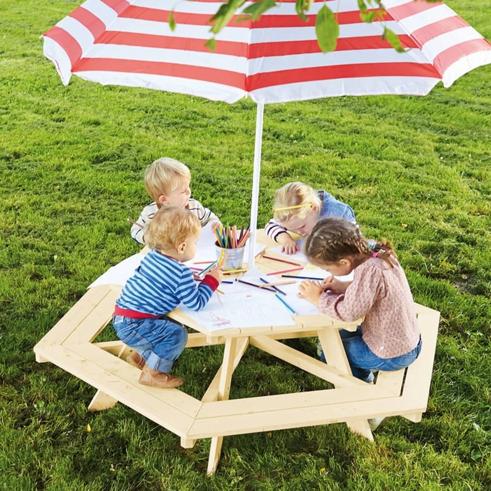 Le mobilier pour enfants nicki 6-eck de la marque pinolino se compose d’une table et de 6 bancs. Il est parfait pour les activités à l’extérieur dans le jardin ou sur la terrasse : peindre, manger, jouer ou simplement s’asseoir pour profiter du soleil. Fabriqué en bois d’épicéa massif et non traité, l’ensemble de meubles est robuste et peut accueillir jusqu’à 6 enfants. Avec une hauteur d’assise confortable de 28 cm, l’ensemble de table et de bancs est parfait pour les petits athlètes ou les pirates qui souhaitent se détendre lors d’un pique-nique et se reposer avant de partir à nouveau dans leurs aventures.